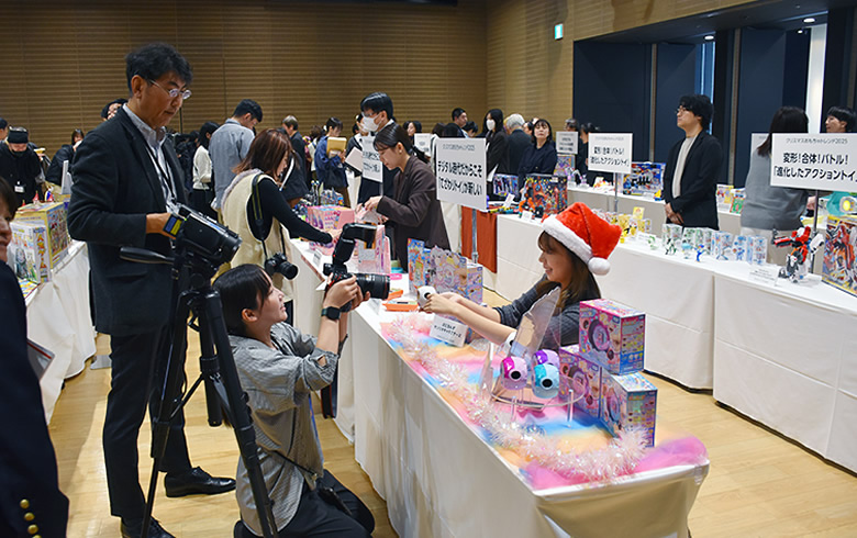 会場では、各社のクリスマスおもちゃを最新のトレンドキーワードごとに一堂に展示。今年は大人も子ども世代を超えて楽しめる「エイジレストイ」や、ぬいぐるみを持ち歩いて楽しむ「ぬい活」関連商品が注目を集め、多数のメディアが気になる商品への取材を行っていました。