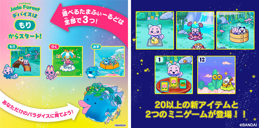 「Tamagotchi Paradise – Jade Forest」は、新たに発見された「もり」のフィールドからお世話がスタート。育成を続けていくと「りく」「みず」のフィールドでも遊べるようになります。また、新たに20以上の新アイテムと2つのミニゲームが登場するほか、15以上の新しいたまごっちが育成可能になります。
