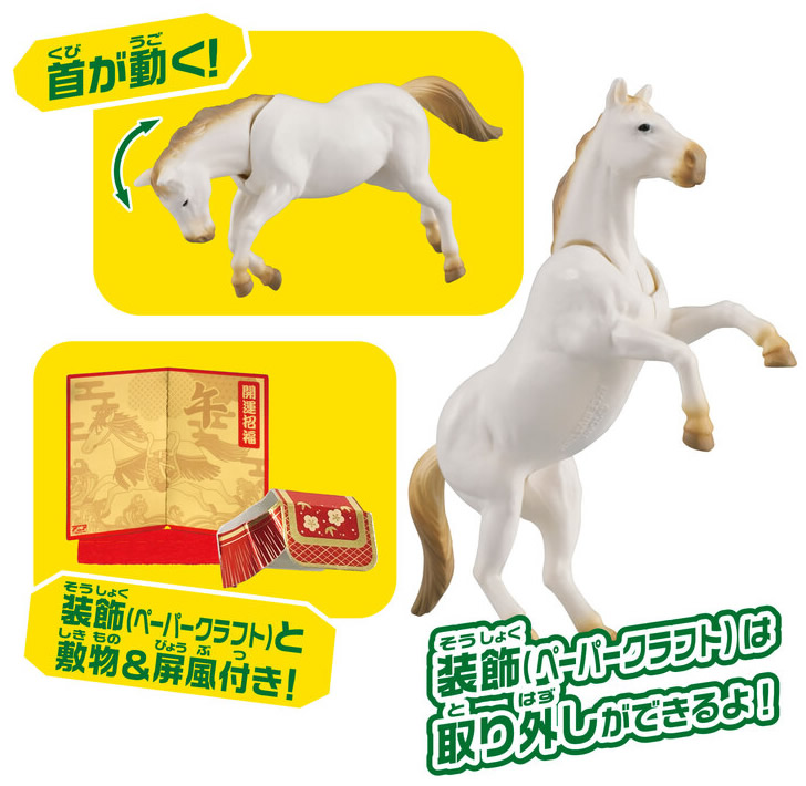 第11弾となる今回は、そんな縁起のいい「馬」の中でも新年にふさわしい白いサラブレッドが採用。後ろ足で立ち上がる姿のポージングも可能で、儀式のときなどにつける華やかな鞍が干支アニア初のペーパークラフトで付属しています。