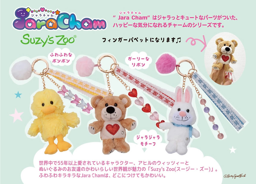世界中で愛されているアメリカ生まれの人気キャラクター「Suzy’s Zoo(スージー・ズー)」が、ジャラとキュートなパーツがついたフィンガーパペットになって登場!マスコットチャーム「Jara Cham(ジャラチャム)Suzy’s Zoo」が、11月下旬に発売されます。