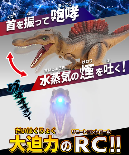 この商品は、昨年発売された「RC生き物シリーズ 爆炎バーニングティラノ」と一緒に遊べる待望の新モデルで、恐竜の中でも高い人気を誇るスピノサウルスをモチーフに、氷をテーマにしたギミックでダイナミックに楽しめます。