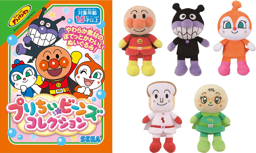 『プリちぃビーンズ コレクション』は、アンパンマンに登場するキャラクター全45種を展開しており、1.5歳から楽しめるコンパクトサイズのぬいぐるみシリーズです。お尻の部分にペレット(おもり)が入っているので安定して座らせることができ、清潔に保てる“手洗い対応”で小さなお子さまにも安心です。